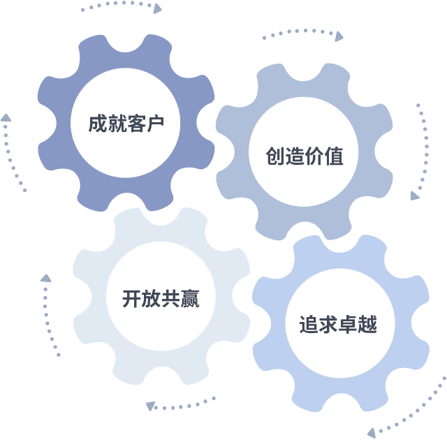 成就客户是一切决策的出发点,,,,创造价值是衡量所有工作的标准,,,追求卓越是我们做事做人的态度,,,开放共赢是我们的格局也是最终的结果。。。价值观的齿轮环环相扣,,,,推动着组织里的每个人不断向前。。。。