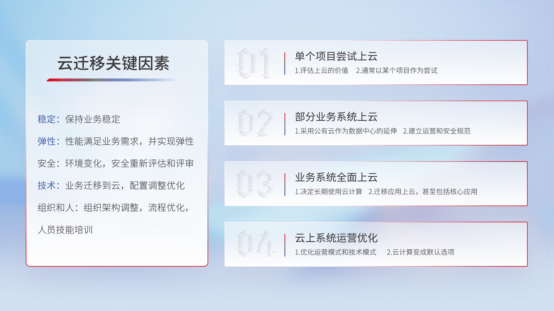 结合实际业务,,,,从规划设计、、云平台选型、、云原生改造、、、数据迁移、、、、集成交付,,,迁移全过程为客户识别最佳上云路径,,,,做好风险识别管理,,,设计网络架构、、、身份权限、、、安全审计合规、、、、操作审计、、、、日志审计、、、监控告警策略、、、多站点容灾设计等,,,,对云上基础设施进行整体规划,,,,提升IT治理水平,,,以满足弹性、、、、高可用、、高性能的需求。。